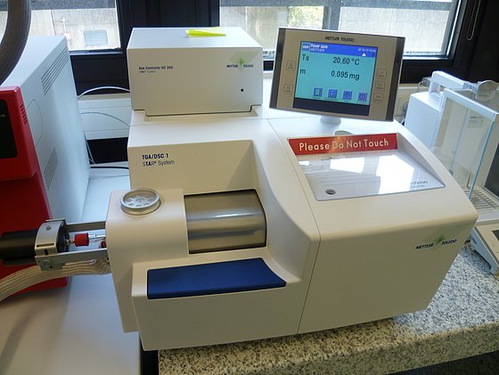 Die Thermogravimetrie ermöglicht die Ermittlung der Massenänderung einer Probe in Abhängigkeit von der Temperatur bei variabler Zusammensetzung der umgebenden Atmosphäre. Hierbei können Phasenumwandlungen, Zersetzungsprozesse und chemische Reaktionen untersucht werden. Zudem ist zur Untersuchung des Wärmestroms eine Kalorimetriefunktion integriert. Auch ein Anschluss für ein Massen- und ein Fouriertransform-Infrarotspektrometer zwecks Untersuchung der leichtflüchtigen, temperaturabhängig aus der Probe freigesetzten Verbrennungsprodukte vorhanden.